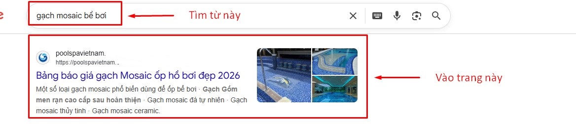 - Bước 2: Tìm từ trên xuống dưới sẽ thấy trang https://poolspavietnam.***.***/***-mosaic/ thì bấm vào đó