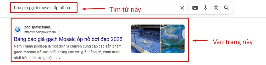- Bước 2: Tìm từ trên xuống dưới sẽ thấy trang https://poolspavietnam.***.***/***-mosaic/ thì bấm vào đó